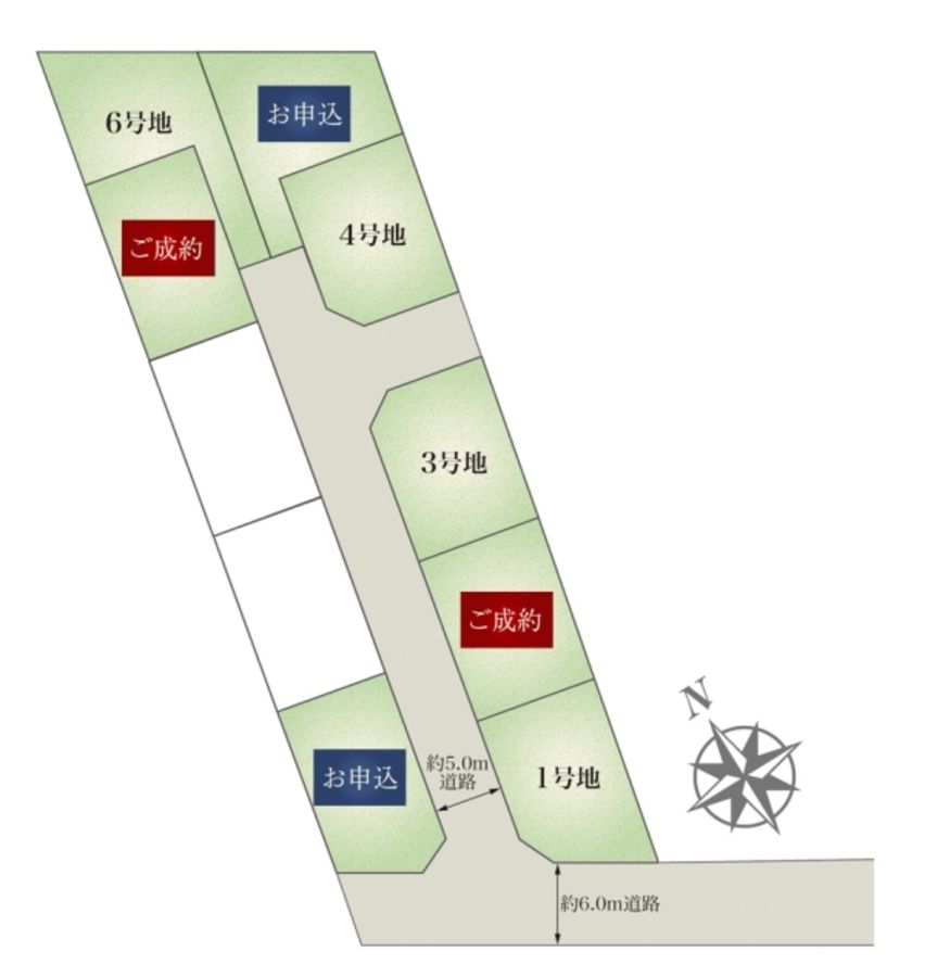 - 110.83m2(1号地)、113.03m2(3号地)、113.01m2(4号地)、113.51m2(6号地) 私道負担なし