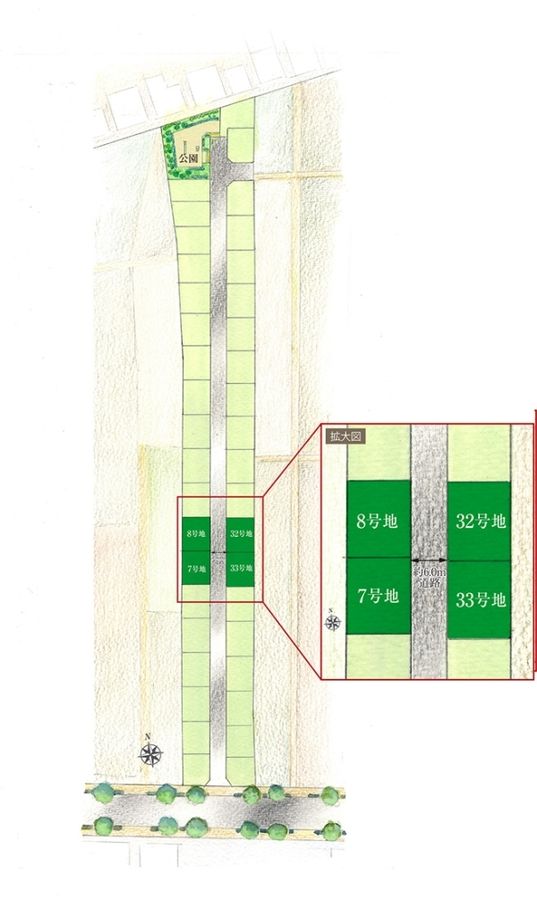 - 115.01m2(7号地)、115.02m2(8号地)、115.02m2(32号地)、115.02m2(33号地) 全て私道負担なし