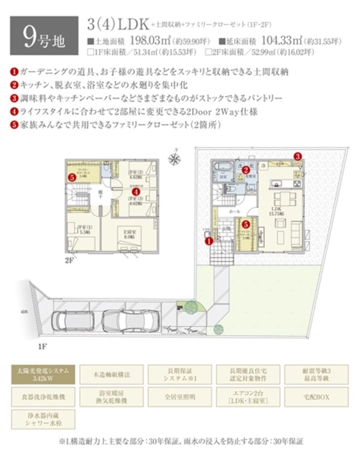 - 3LDK(2号地、3号地、9号地)、4LDK(4号地)