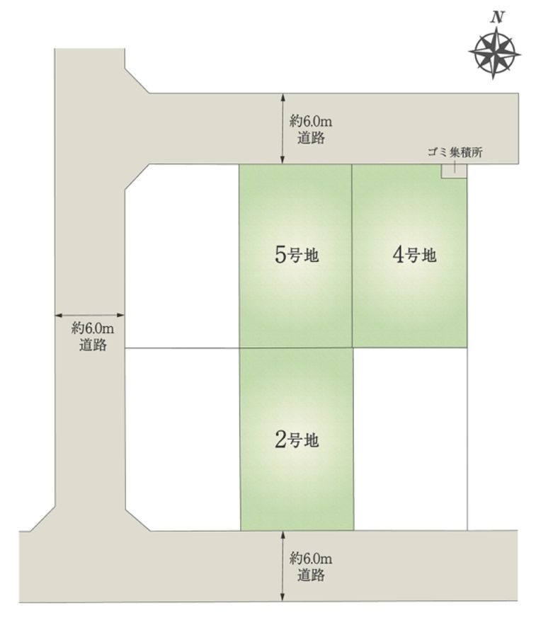 - 149.95m2(2号地)、149.95m2(4号地)、149.97m2(5号地) 私道負担なし