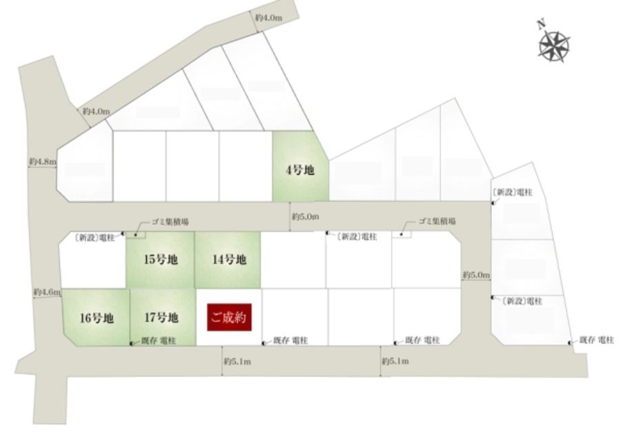 - 108.55m2(4号地)、108.56m2(14号地)、108.60m2(15号地)、108.60m2(16号地)、108.60m2(17号地) 全て私道負担なし