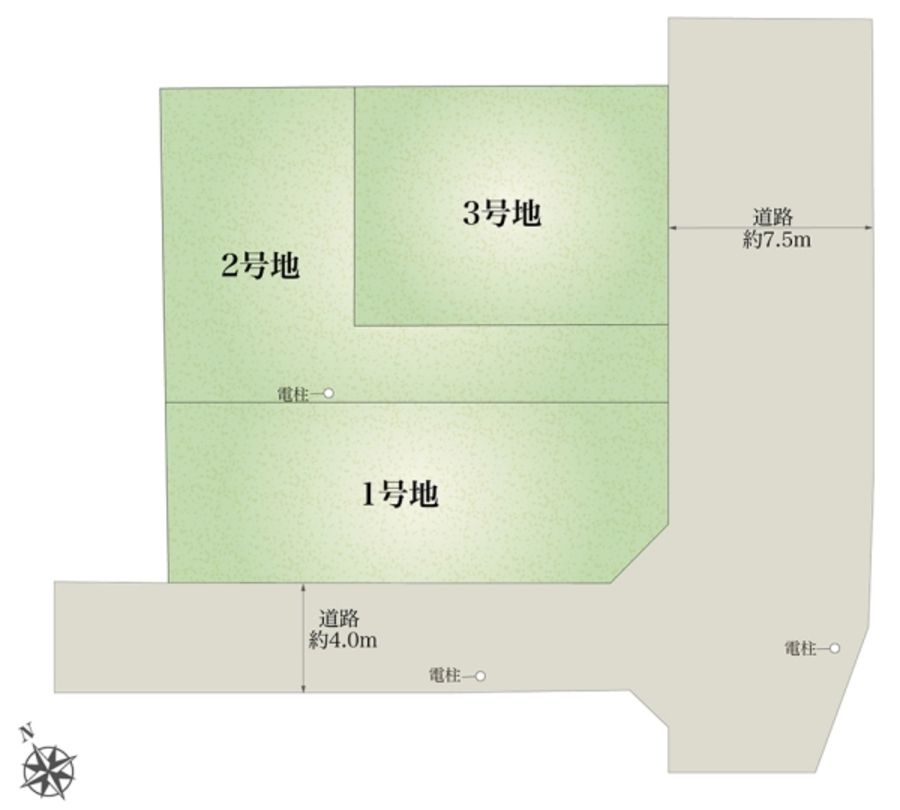 - 118.56m2(1号地)、112.27m2(2号地)、100.11m2(3号地) 私道負担なし