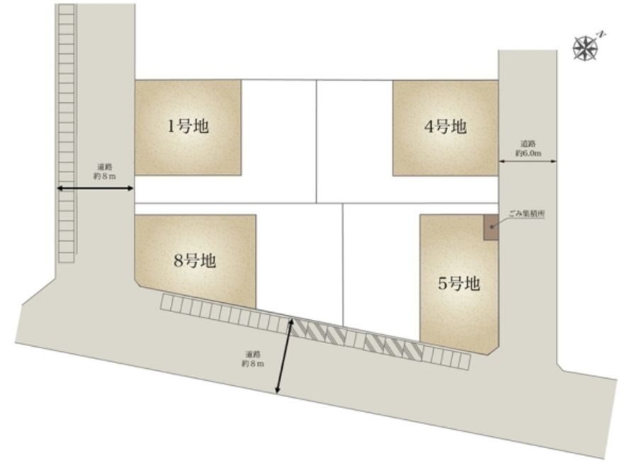 - 104.72m2(1号地)、104.69m2(4号地)、105.11m2(5号地)、103.71m2(8号地) 私道負担なし