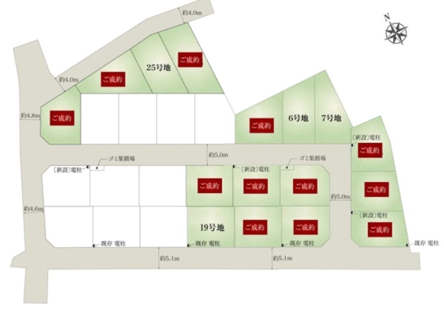 - 108.55m2(6号地)、111.13m2(7号地)、108.60m2(19号地)、108.55m2(25号地) 私道負担なし