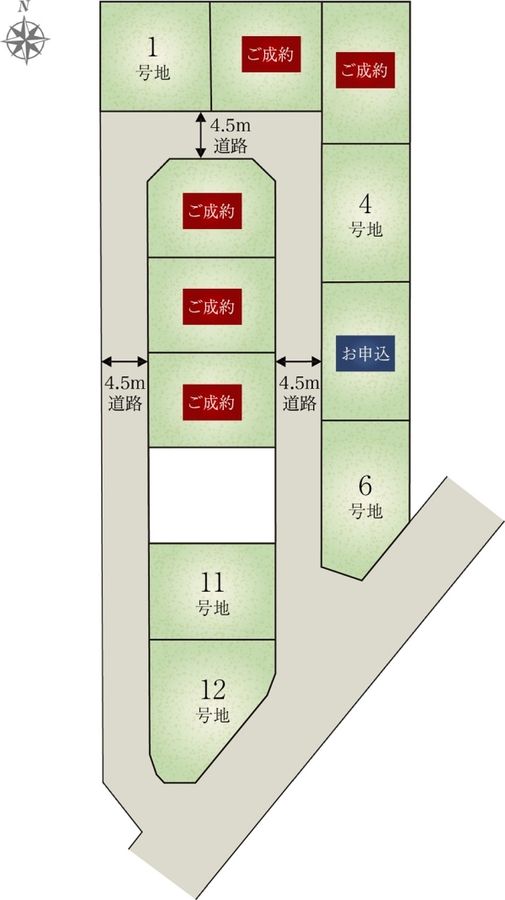 - 110.09m2(1号地)、110.08m2(4号地)、112.88m2(6号地)、110.09m2(11号地)、126.19m2(12号地) 私道負担なし