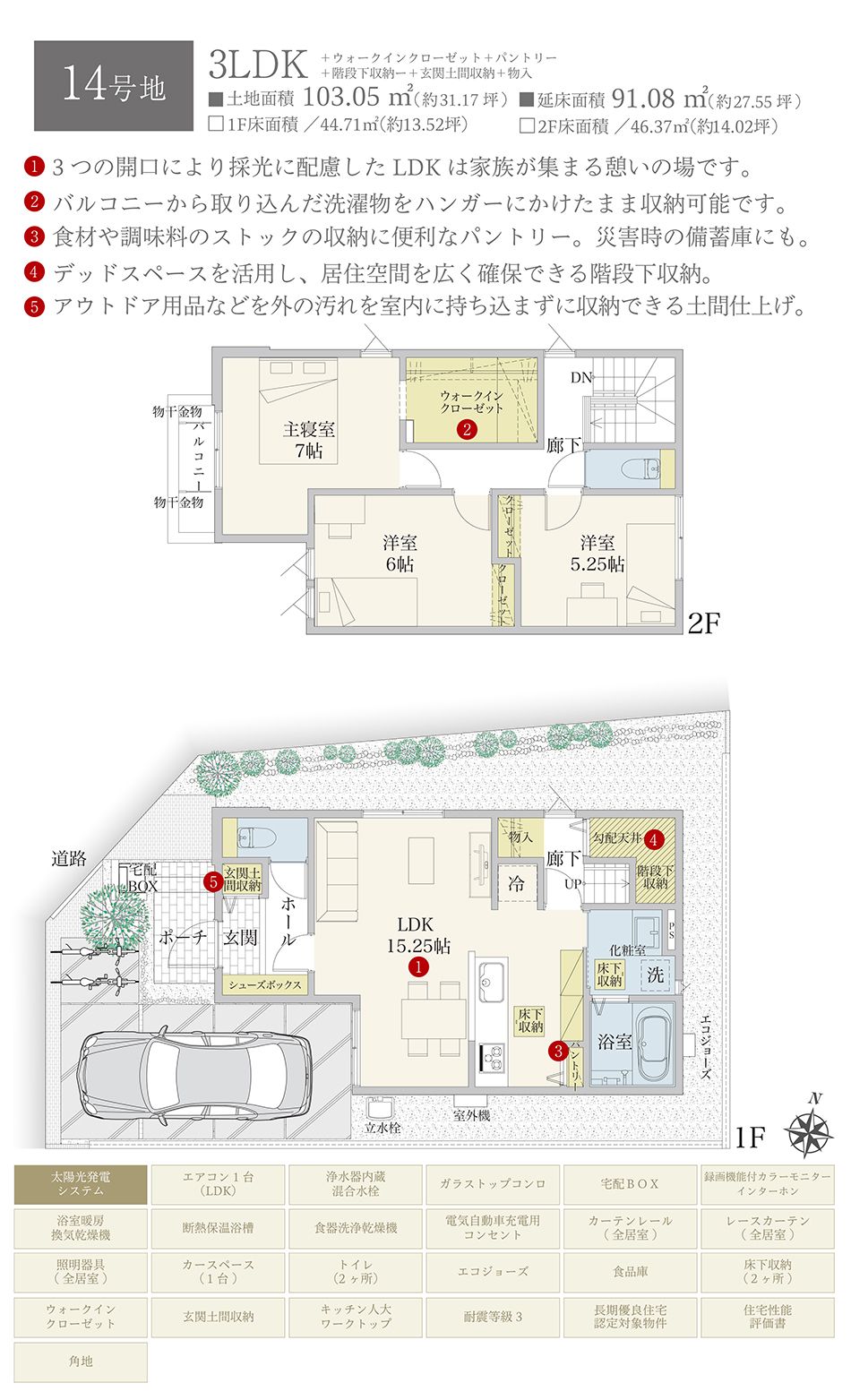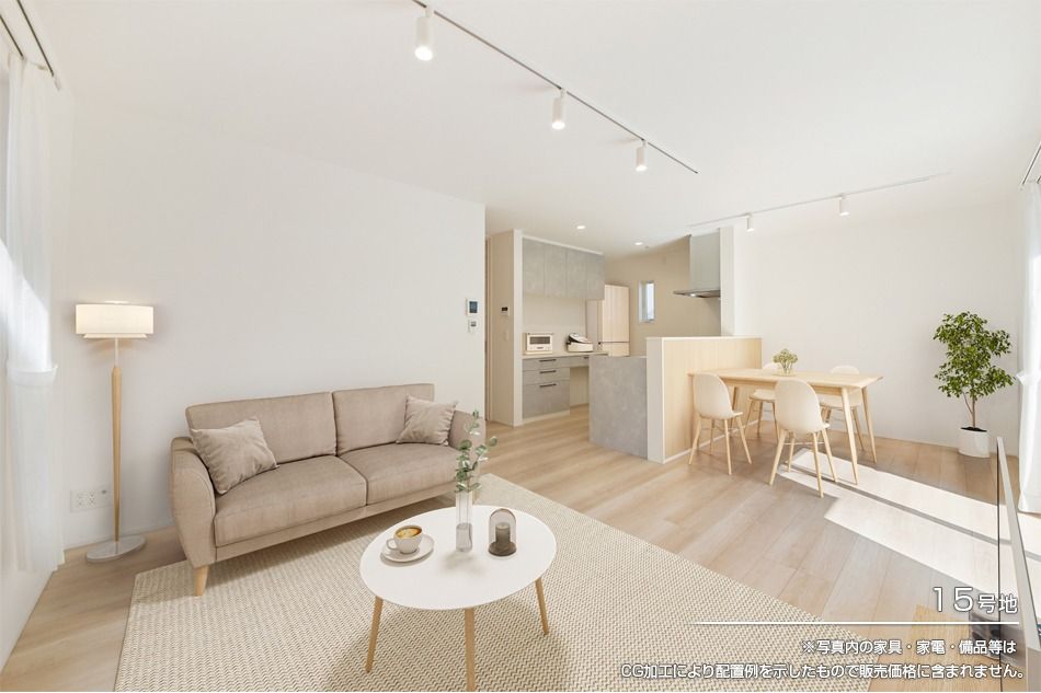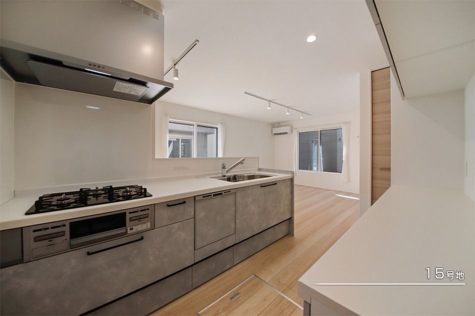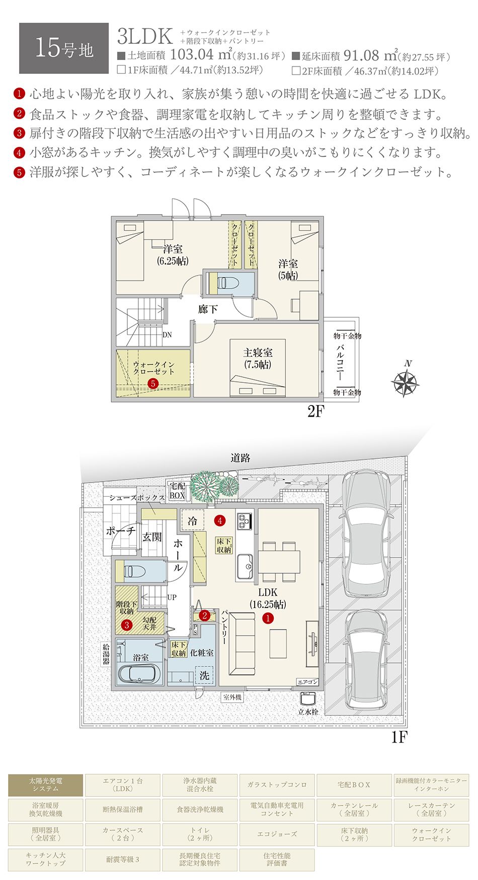 - 102.49m2(12号地)、102.51m2(13号地)、103.05m2(14号地)、103.04m2(15号地) 私道負担なし