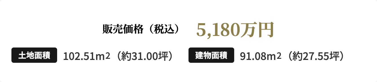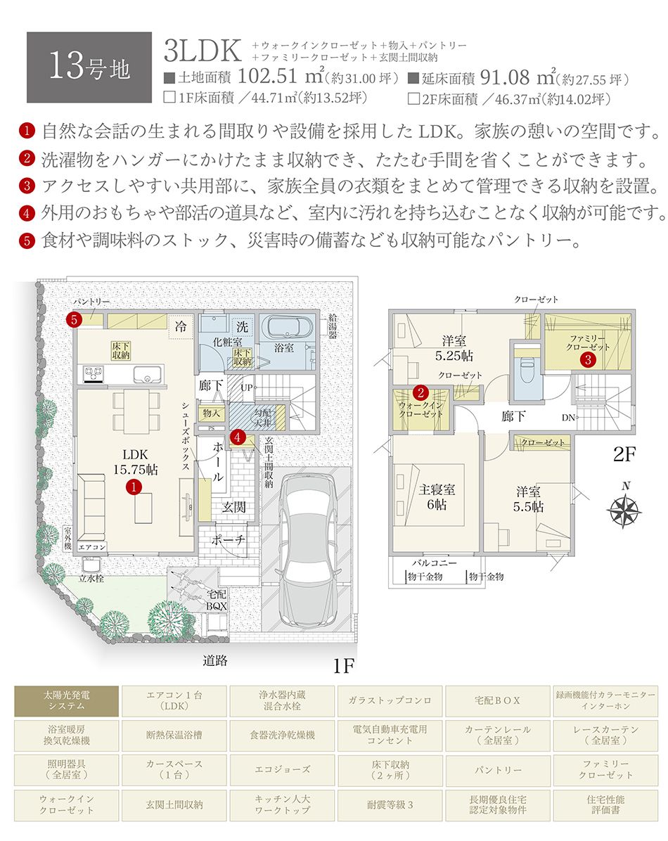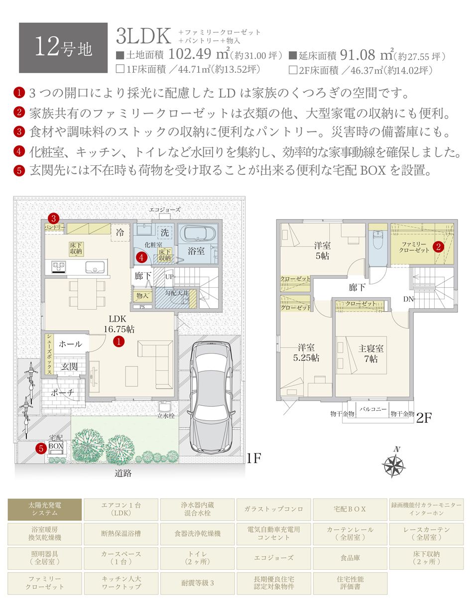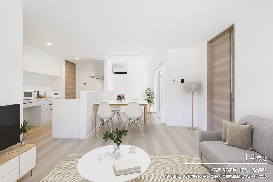 - 102.49m2(12号地)、102.51m2(13号地)、103.05m2(14号地)、103.04m2(15号地) 私道負担なし