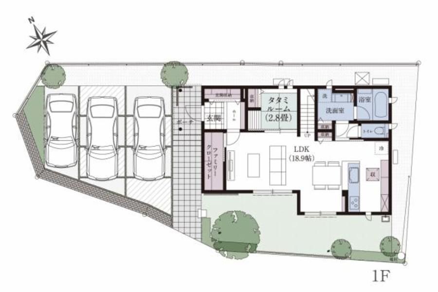 土地面積が54.90坪と比較的小さめですが、敷地が横に広い為駐車場3台と建物、
