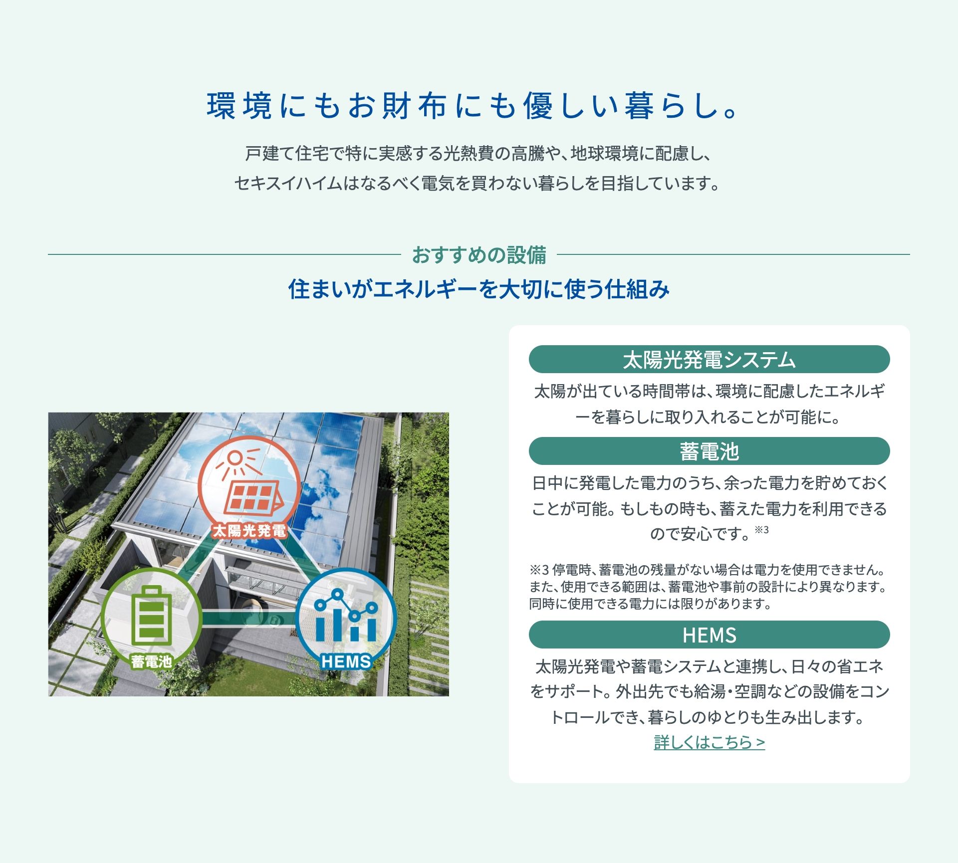 太陽光発電システム・蓄電池・HEMS(ホームエネルギーマネジメントシステム)を搭載。