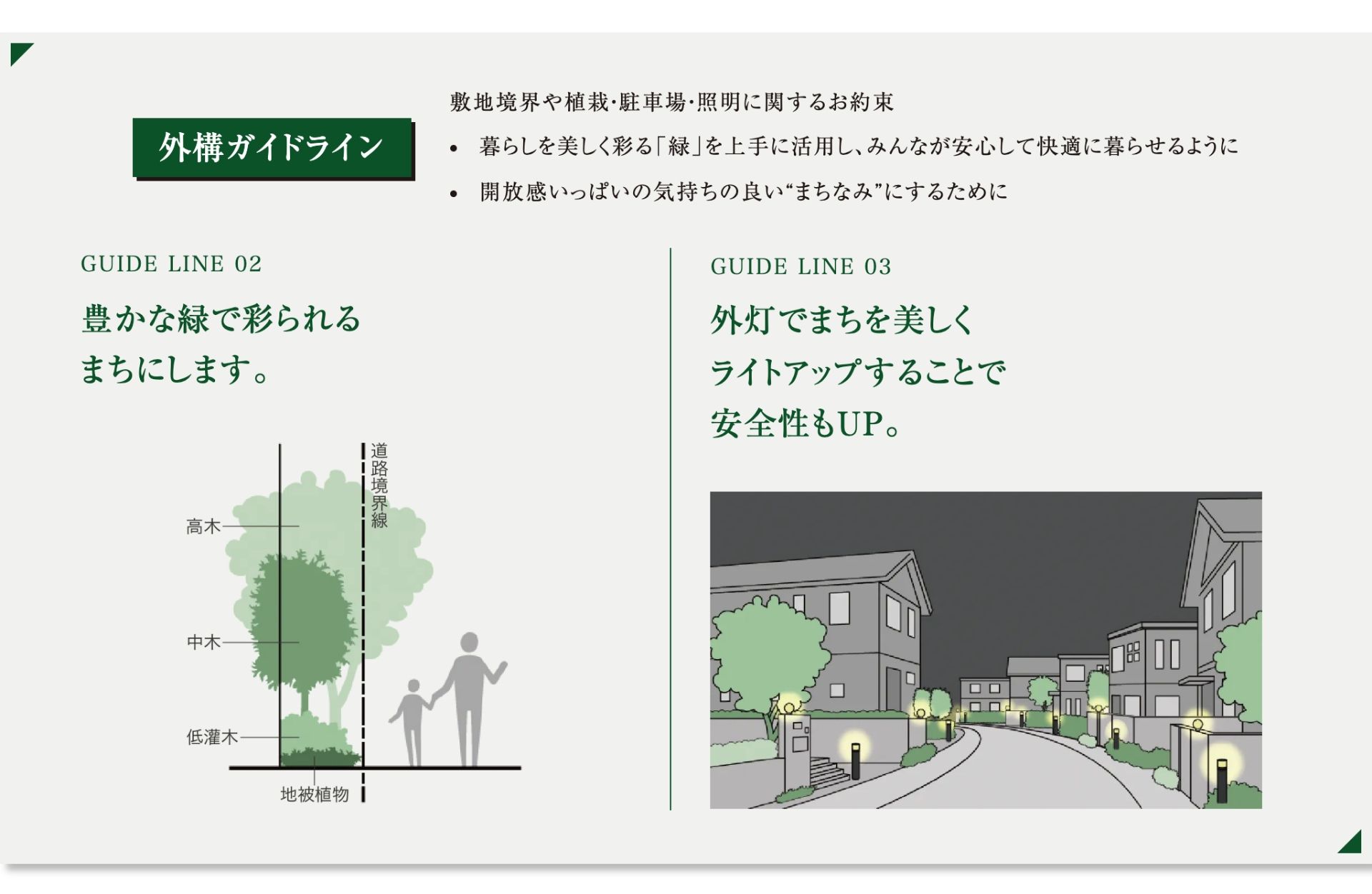 ガイドラインに沿って統一された外構計画でワンランク上の分譲地が完成します。