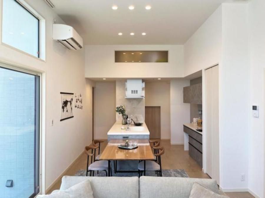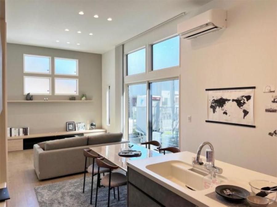 ■天井高3.3mの開放的なLDK。高窓から日の光が入り、明るく居心地の良い空間です。