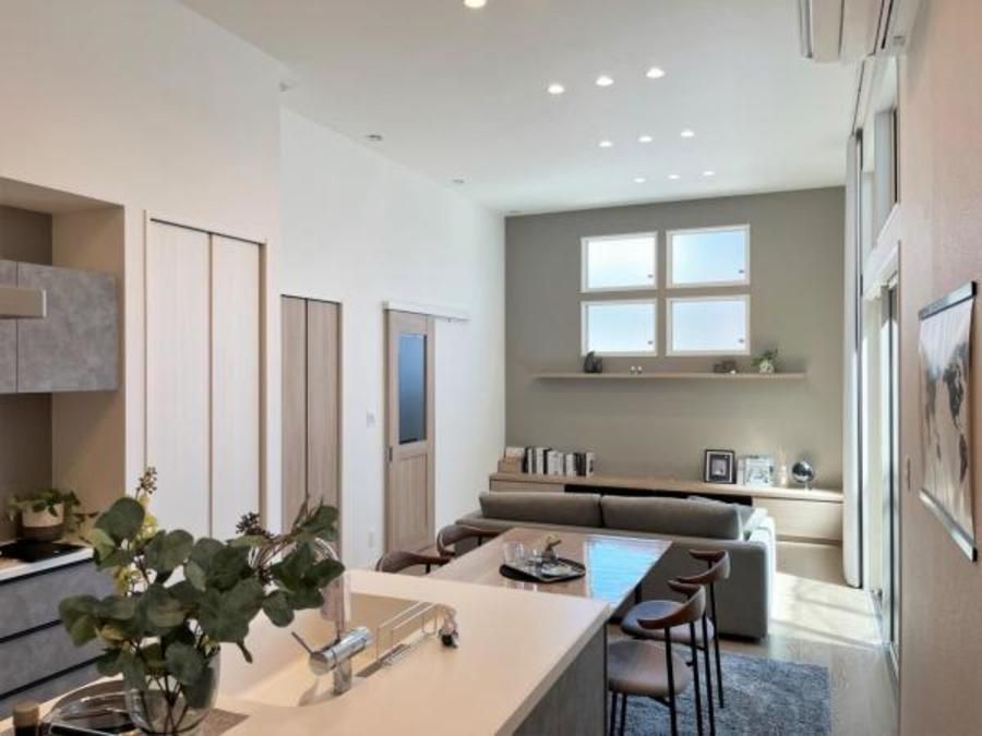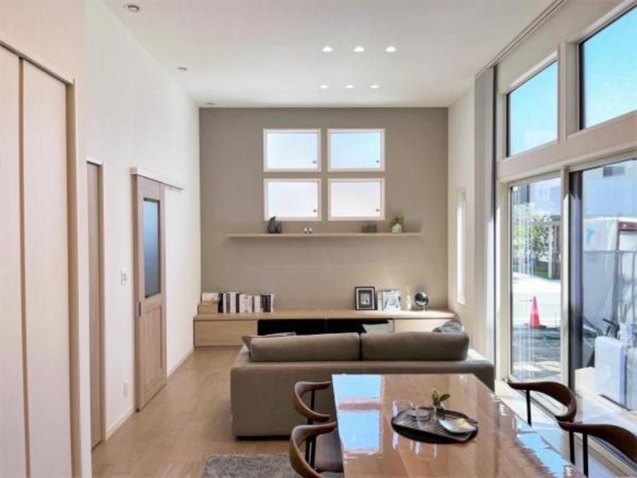■天井高3.3mの開放的なLDK。高窓から日の光が入り、明るく居心地の良い空間です。