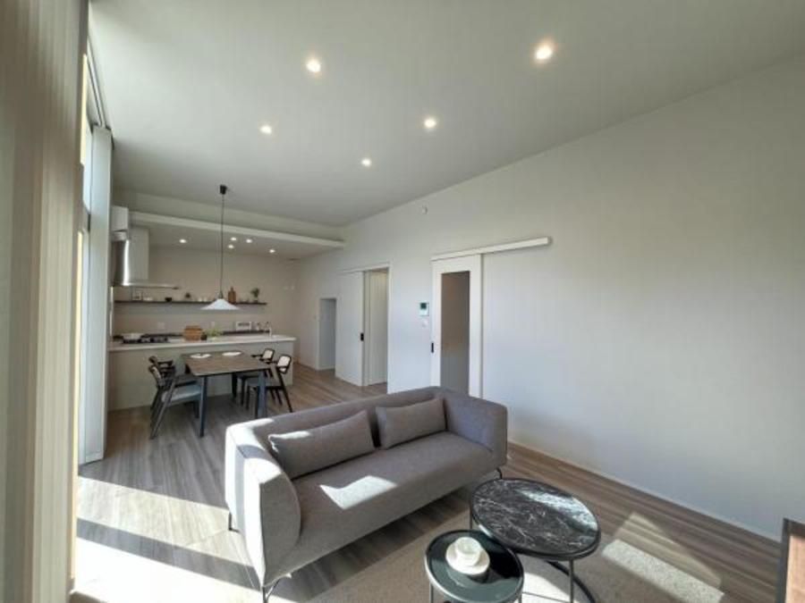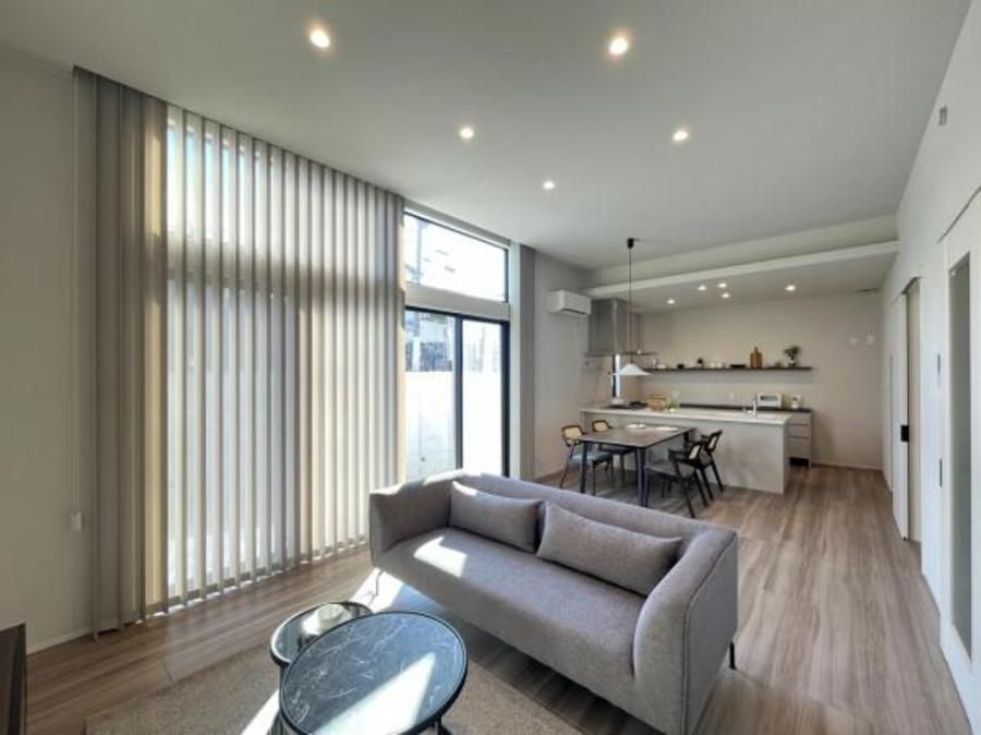 ■リビングは天井高3.0mの開放的な空間。南に隣接するお庭にはテラスデッキを採用しており