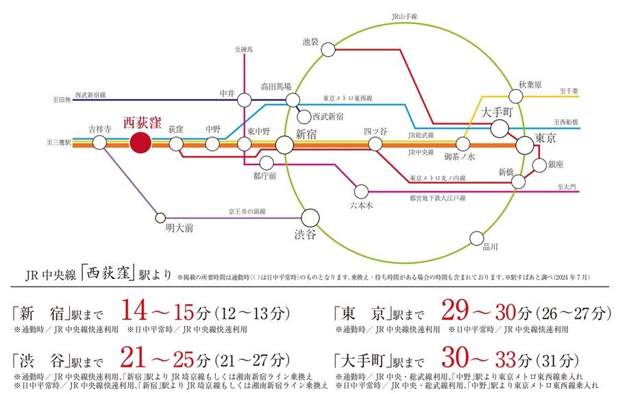 JR中央線・総武線「西荻窪」駅まで徒歩9分。「新宿」駅、「東京」駅、「大手町」駅へダイレクトアクセス