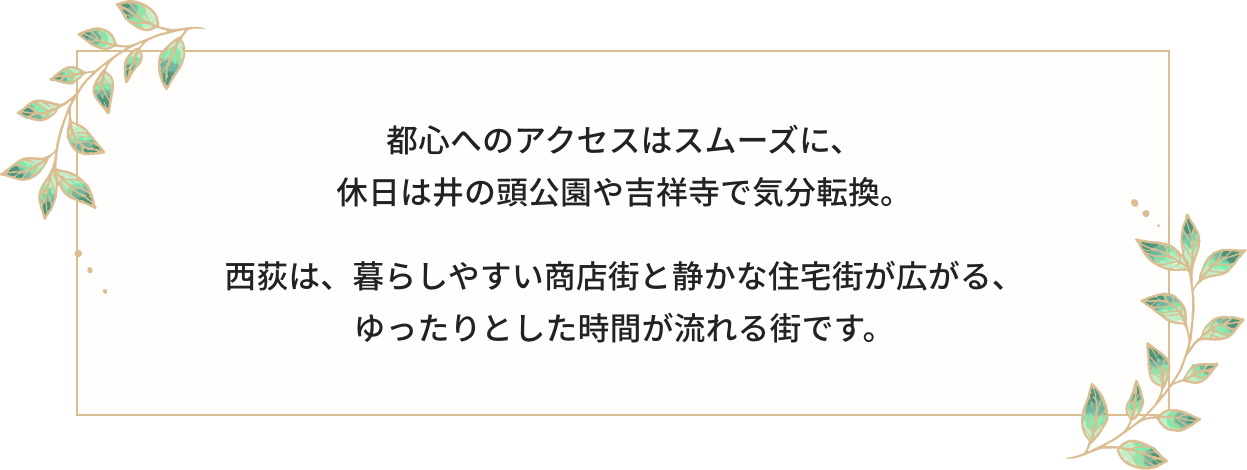 静かな西荻に住み、アクティブに吉祥寺へ出かける、都会的な刺激と静かな時間、その両方を楽しめる余裕ある暮らしが叶います。