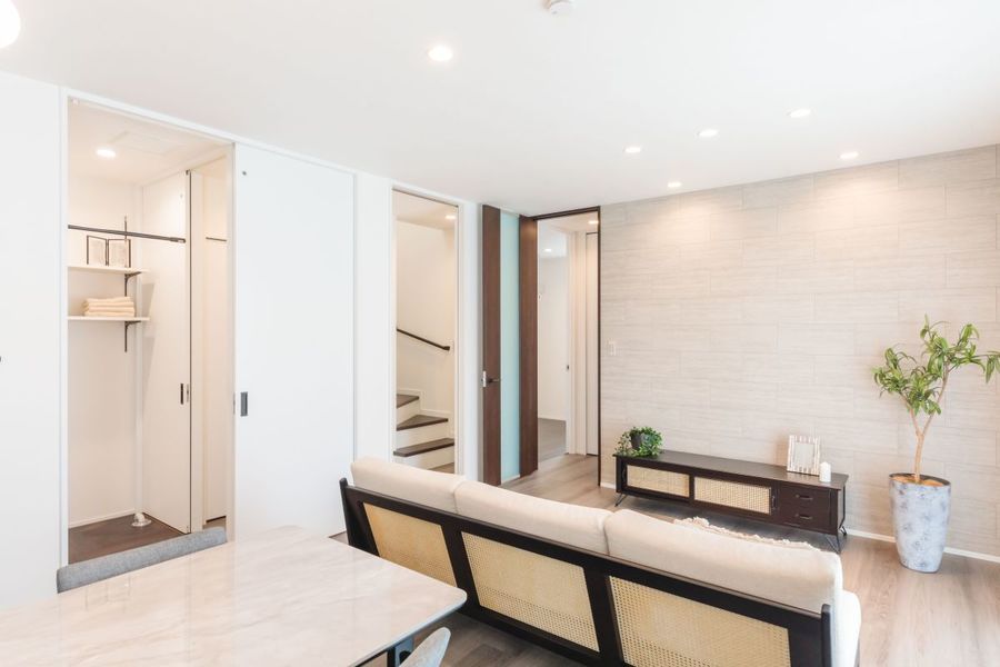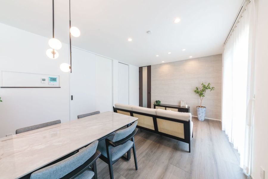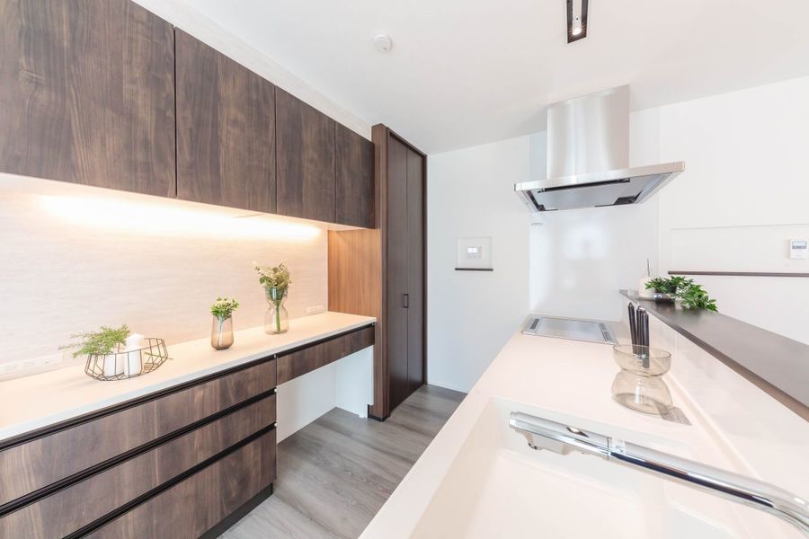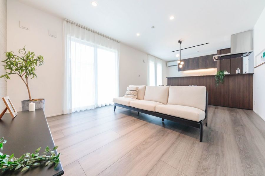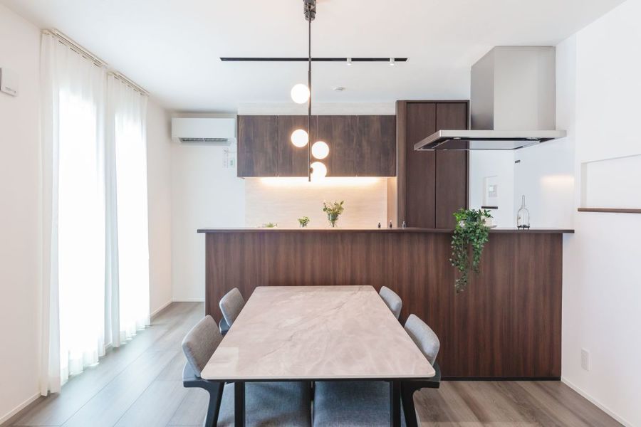 対面キッチンを中心に家族の気配がつながる空間設計。
