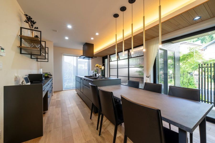 ・外と中がつながり空間に一体感をもたらす広々LDK×アウトドアリビング×NOOKゆとりの敷地が実現するお庭を楽しむテラス