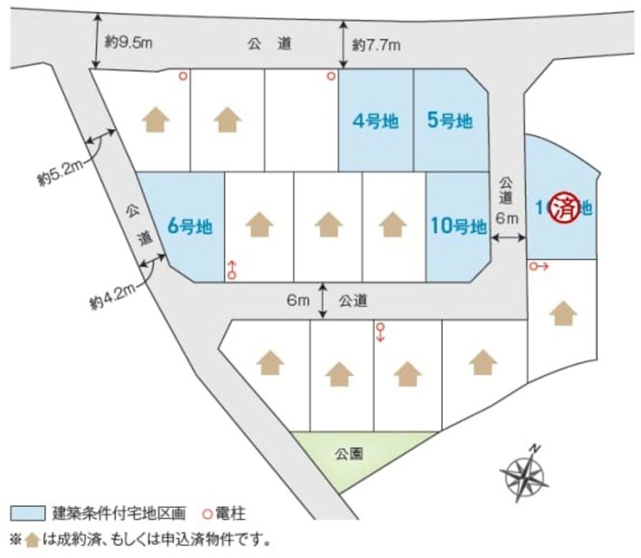 道路幅員:4.2m~9.5m アスファルト舗装 団地内:公道6m、北側:公道約7.7m~約9.5m、西側:公道約4.2m~約5.2m