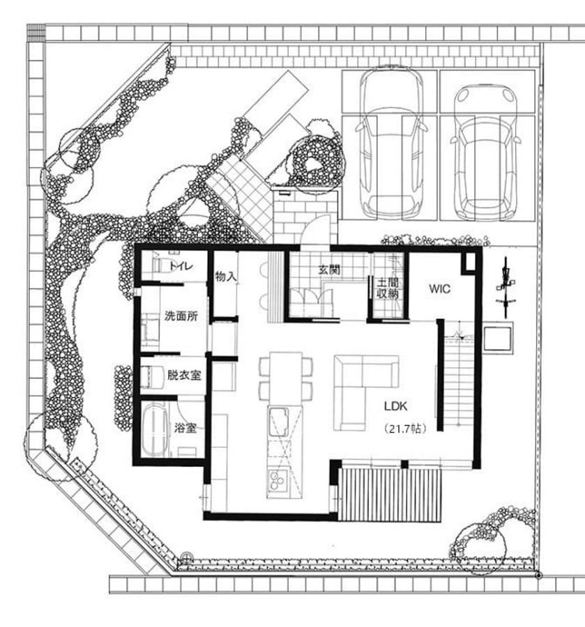キッチン横に洗面所があり、家事動線がコンパクトに。玄関にはベビーカーやアウトドアグッズをしまえる土間収納を設けた、豊富な収納スペースも魅力です。
