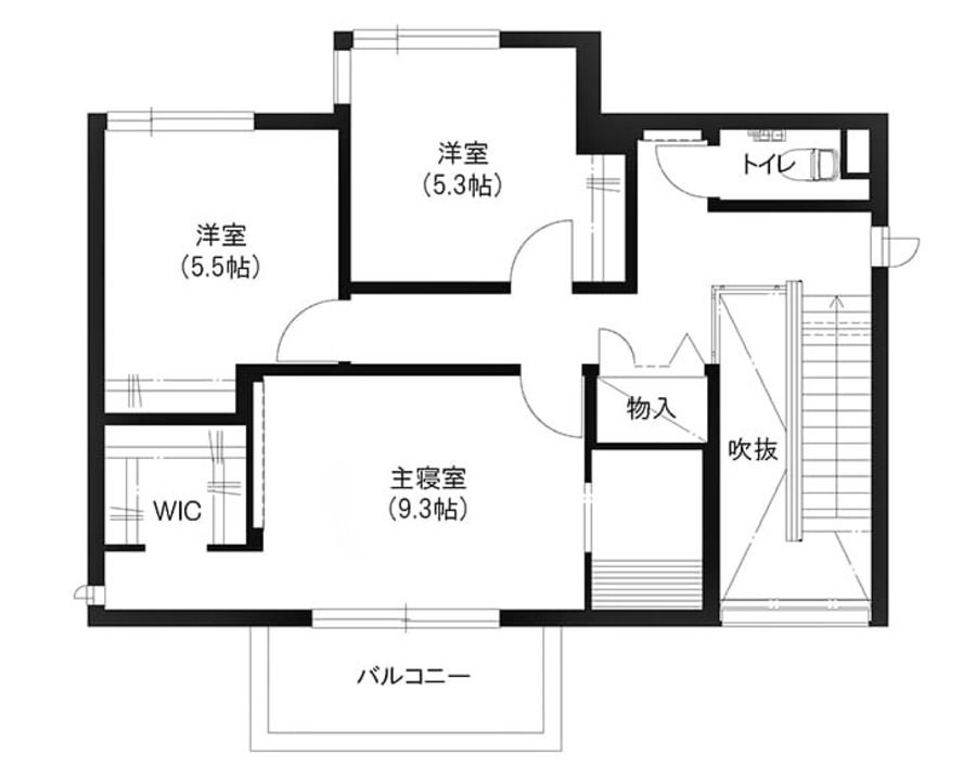 2階への階段は吹き抜けとなっており、開放感のある造りとなっております。また、主寝室が9.3帖とゆとりを持った空間で、WICを備えております。