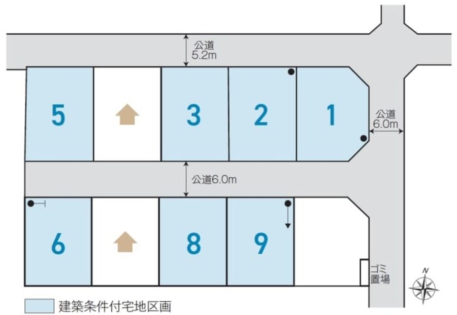 道路幅員:5.2m~6m アスファルト舗装 団地内公道6.0m、北側公道5.2m、東側公道6.0m