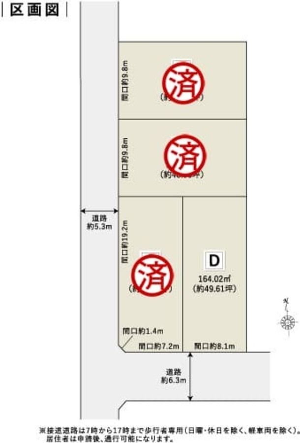 〇南・西側道路は、7時から17時まで歩行者専用道路となります(日曜・休日を除く、軽車両を除く)。居住者は申請後通行可能です。