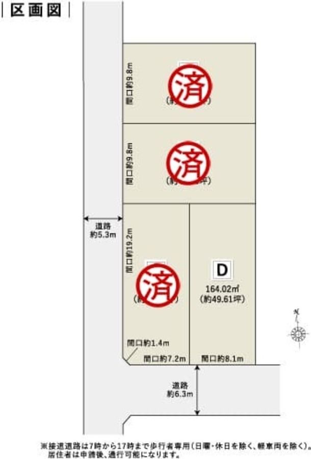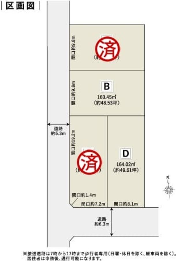 道路幅員:5.3m~6.3m アスファルト舗装 南側道路6.3m~6.3m、西側道路5.3m~5.3m※美しいまちなみと豊かな住環境を確保するため、建物や外構に関するまちなみガイドラインを定めています。