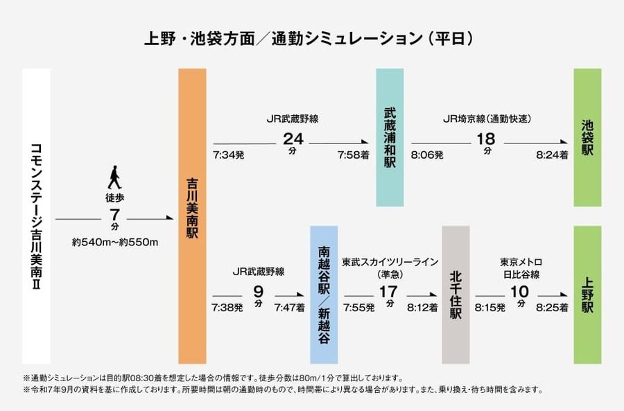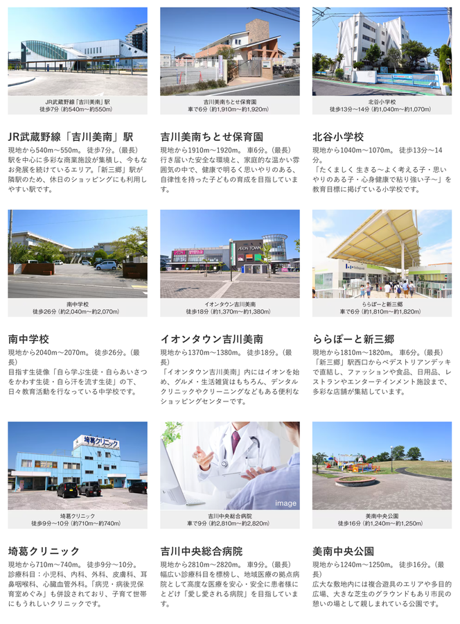 - JR武蔵野線「吉川美南」駅まで徒歩7分(最長)