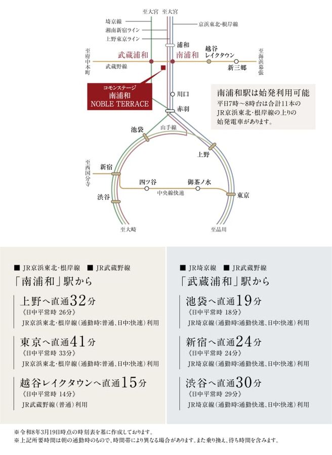 JR「南浦和」駅からは京浜東北・根岸線の上りの始発が利用可能。