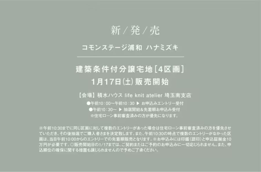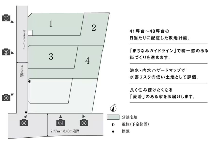 ◆良好な住環境を保つため、「まちなみガイドライン」を制定しております。 ◆分譲地内のゴミステーション区画は購入者の共有持ち分となります。(1/6)建築条件 本分譲地の土地売買契約は、契約締結後3ヶ月以内に売主である積水ハウス株式会社との間で建築工事請負契約が成立することを条件として効力を生じます。期限までに、建築工事請負契約が成立しなかったときは、土地売買契約の無効が確定し、受領済の手付金等は、全額無利息にてすみやかに返還いたします。