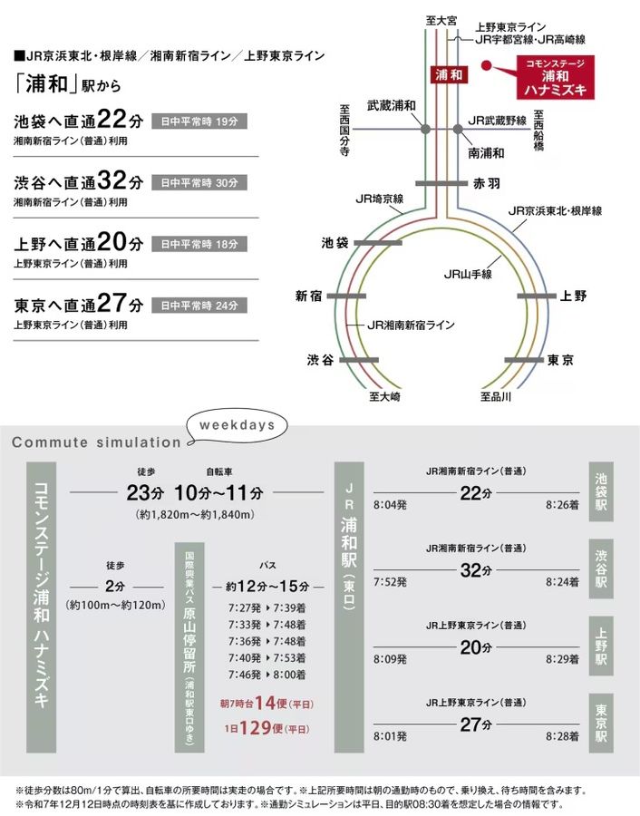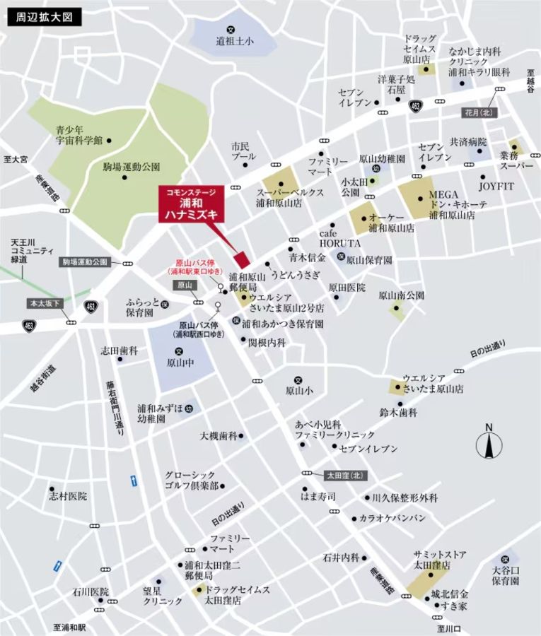 最寄バス停「原山」停留所まで徒歩2分(最長)、「国際興業バス」に乗車、JR京浜東北・根岸線「浦和」駅まで13分