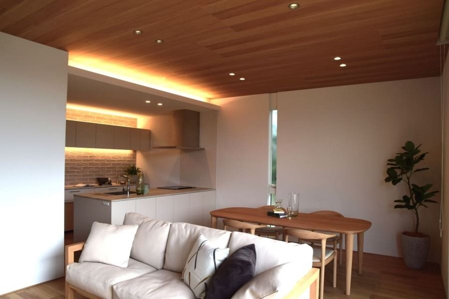 ・室内天井と軒裏を木質にすることで内と外の境界があいまいとなり、空間の広がりを感じられます。