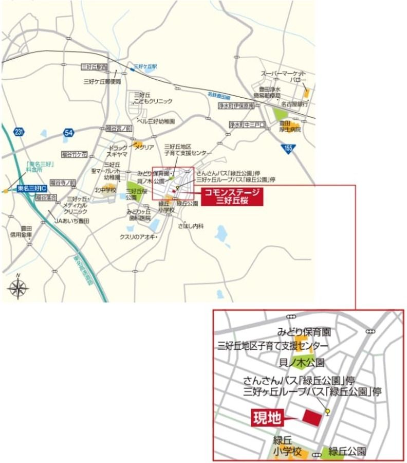 最寄バス停「緑丘公園」停留所まで徒歩3分(最長)、「三好ヶ丘ループバス」に乗車、名鉄豊田線三好ケ丘駅まで9分