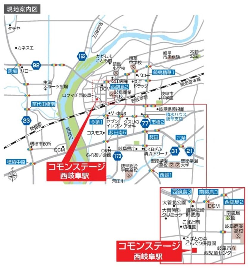 JR東海道本線「西岐阜」駅まで徒歩17~18分(約1300m~1380m)の立地で、周辺には生活利便施設が充実。