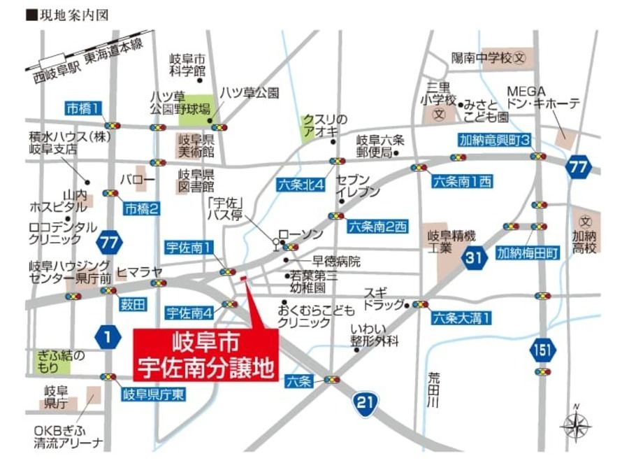 JR東海道本線「西岐阜」駅まで徒歩24分(約1,900m~1,920m)、車をよく使われる方も県道77号線や国道21号線にすぐ出られるので、各方面へのアクセスが良好です。