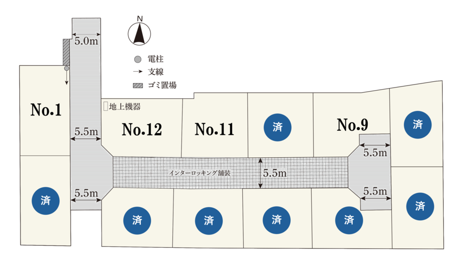 地番 1番2(公衆用道路、468㎡)は各々1/13ずつ共有して頂きます。/地番 7番8、7番9、8番19(公衆用道路、87㎡)は各々1/24ずつ共有して頂きます。私道(491.05平方メートル)はNo.1~No.12号地、隣地にて各々1/13ずつ共有して頂きます。●道路幅員:5.5m(アスファルト舗装・インターロッキング舗装) 私道