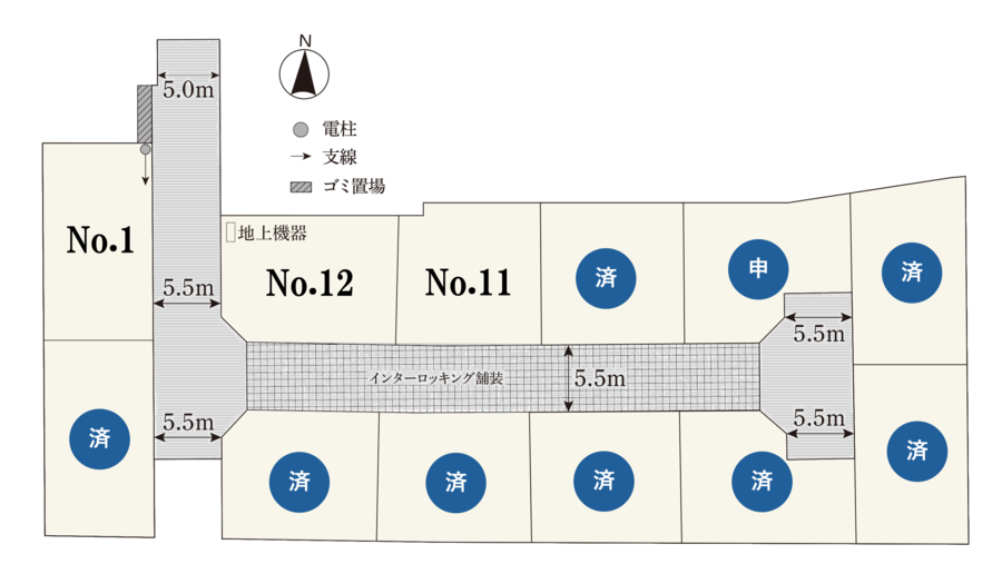 地番 1番2(公衆用道路、468㎡)は各々1/13ずつ共有して頂きます。/地番 7番8、7番9、8番19(公衆用道路、87㎡)は各々1/24ずつ共有して頂きます。私道(491.05平方メートル)はNo.1~No.12号地、隣地にて各々1/13ずつ共有して頂きます。●道路幅員:5.5m(アスファルト舗装・インターロッキング舗装) 私道