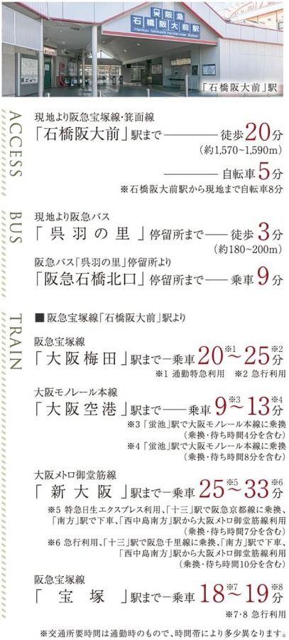 最寄バス停「呉羽の里」停留所まで徒歩3分(最長)、「阪急バス」に乗車、阪急宝塚本線「石橋阪大前」駅まで9分