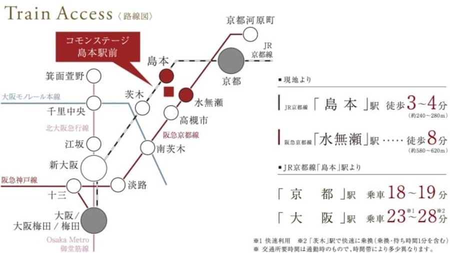 徒歩3~4分のJR「島本」駅から、「京都」駅へ18~19分、「大阪」駅へ23~28分と、主要都市へ快適にアクセス可能。