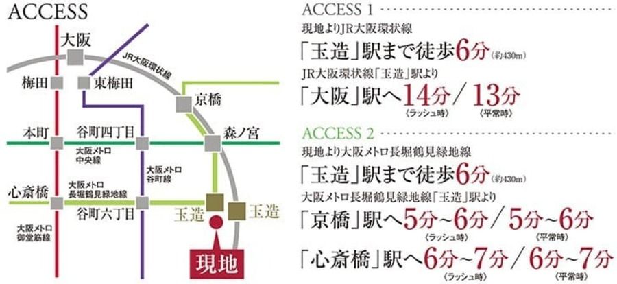 - JR大阪環状線「玉造(JR)」駅まで徒歩6分(最長)