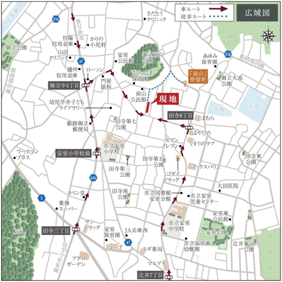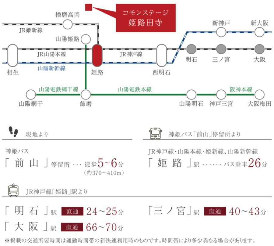 - 最寄バス停「前山」停留所まで徒歩5分~6分、「神姫バス」に乗車、JR神戸線「姫路」駅まで26分