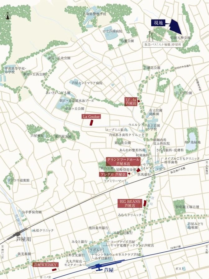 - 最寄バス停「八十塚橋」停留所まで徒歩3分~4分、「阪急バス」に乗車、JR神戸線「芦屋」駅