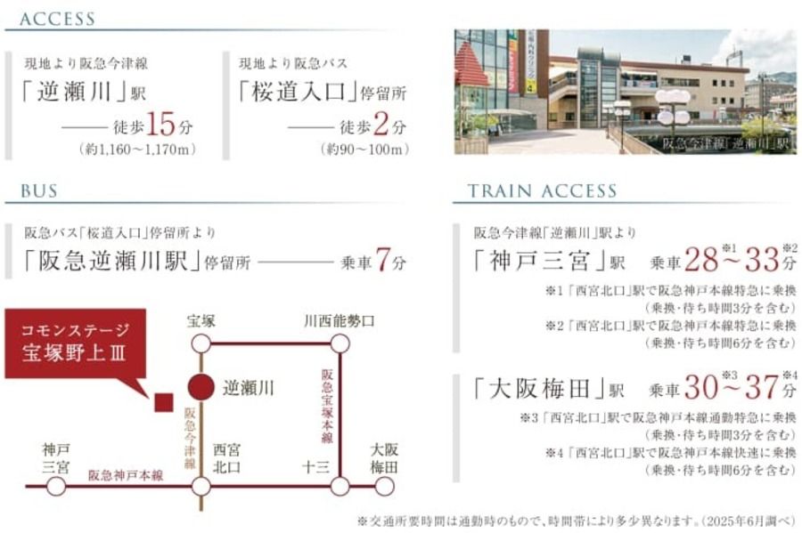 最寄バス停「桜道入口」停留所まで徒歩2分(最長)、「阪急バス」に乗車、阪急今津線「逆瀬川」駅まで7分