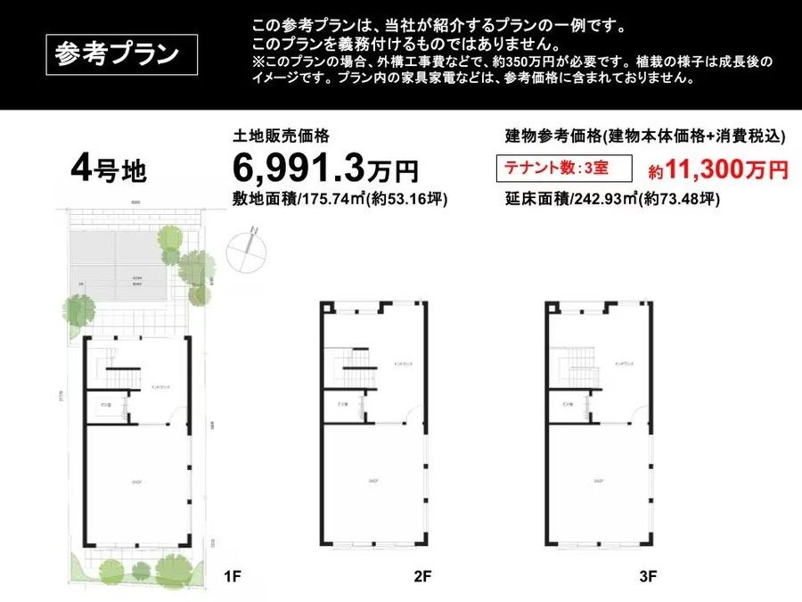 ■土地価格/6,991.3万円■敷地面積/175.74㎡(約53.16坪)■建物参考価格(建物本体価格+消費税)/約11,300万円■延床面積/242.93㎡(約73.48坪)