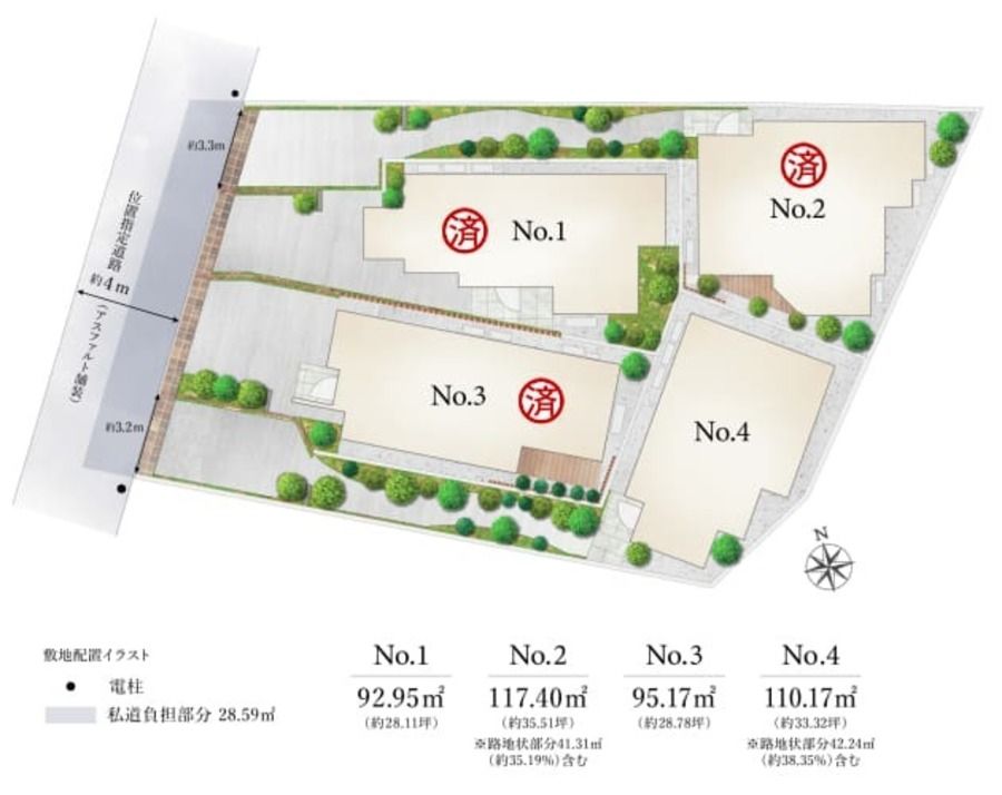 - 110.17㎡ ●私道負担面積 私道負担あり。位置指定道路28.59㎡の持分を1/4ずつ負担していただきます。