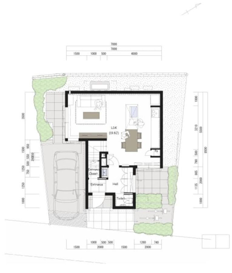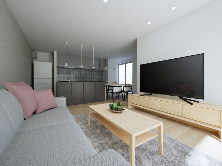 キッチンからリビングダイニングを見渡せる縦長のレイアウト。
