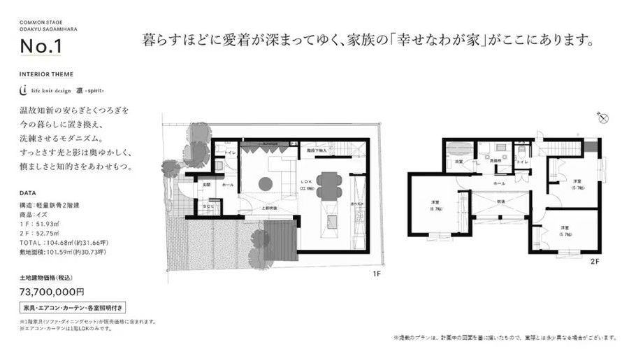 ●建物面積/1F:51.93㎡ 2F:52.75㎡ 計:104.68㎡