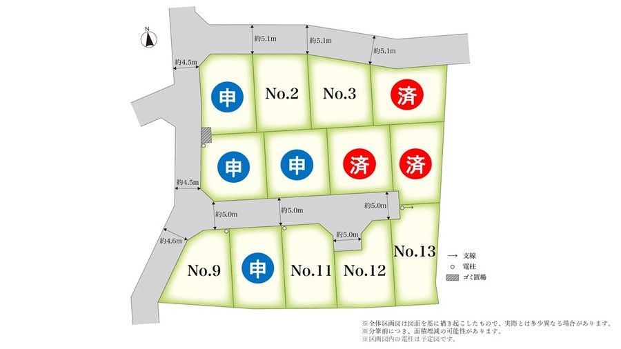 - ●建蔽率/60%(No,9は角地緩和適用にて70%。準防火地域内につき、防火建築物等の場合は+10%緩和。)●容積率/200%
