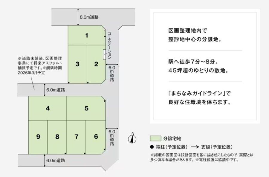 設備/電気:東京電力、ガス:都市ガス(日本瓦斯)、上水道:公営水道、下水道:公共下水道、雨水:宅内浸透式、オーバーフロー分は道路側溝●水道分担金(20mm)/330,000円(税込) ●手付金等の保全機関/西日本住宅産業信用保証株式会社 ●良好なまちなみの形成を図るため、「まちなみガイドライン」を作成しています。 ※確定測量の結果により土地面積が変更になる場合がございます。 ※坪表示は1㎡=0.3025坪で換算し、小数点第3位以下は切り捨てとしました。 ※徒歩分数は1分あたり80mで計算しています。(1分未満は切り上げています。)