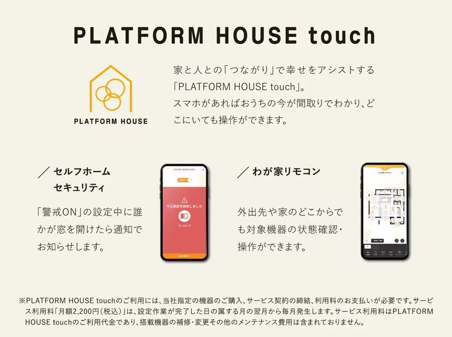 ※PLATFORM HOUSE touchのご利用には、当社指定の機器のご購入、サービス契約の締結、利用料のお支払いが必要です。サービス利用料「月額2,200円(税込)」は、設定作業が完了した日の属する月の翌月から毎月発生します。サービス利用料はPLATFORM HOUSE touchのご利用代金であり、搭載機器の補修・変更その他のメンテナンス費用は含まれておりません。※掲載の外観パース、プランは計画中の図面をもとに描いたもので、実物と異なる場合がございます。
